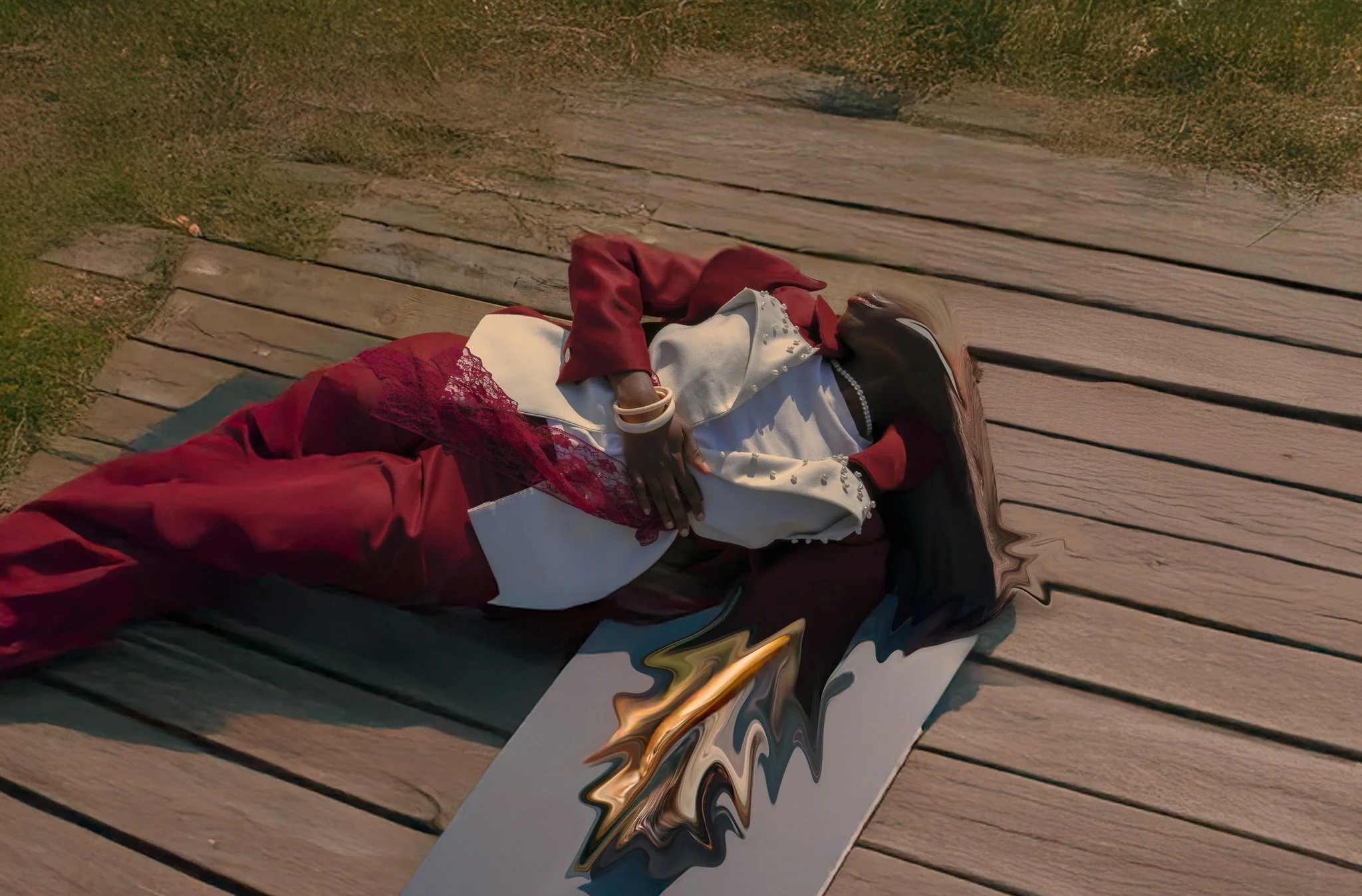 This outfit is part of a conceptual piece that explores the duality between inner strength and outer structure. The deep burgundy suit, paired with a deconstructed, asymmetrical top, represents a journey through contrasts — between the feminine and the masculine, vulnerability and power.