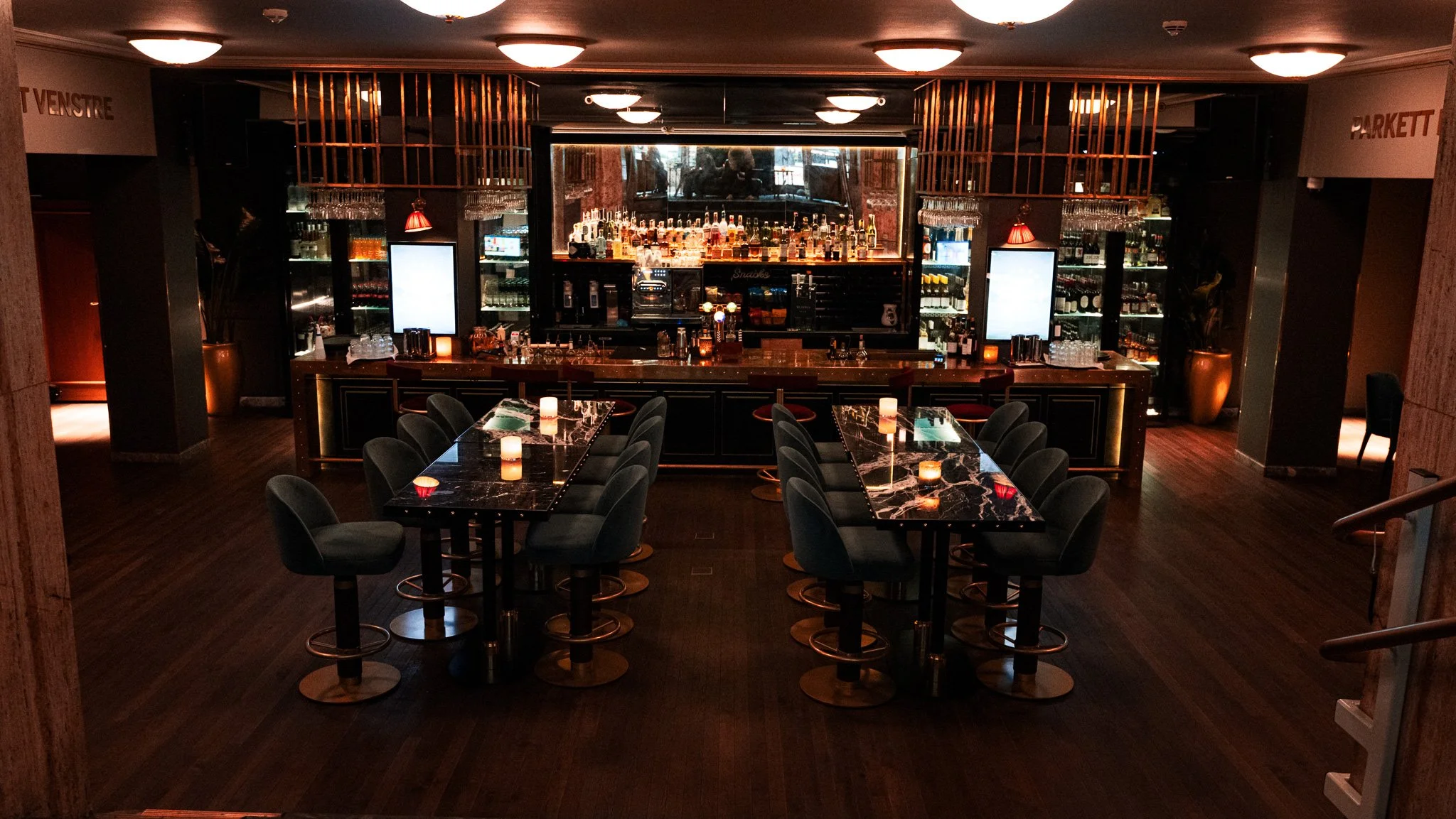 Bathed in the amber glow of the bar, she sits poised—an echo of another era, yet undeniably modern. The fluid lines of her chocolate-brown dress drape with quiet elegance, its floral cutout details whispering of delicacy amidst her steel presence. Silver bracelets catch the dim light, rings glimmer faintly as if secrets rest upon her hands.