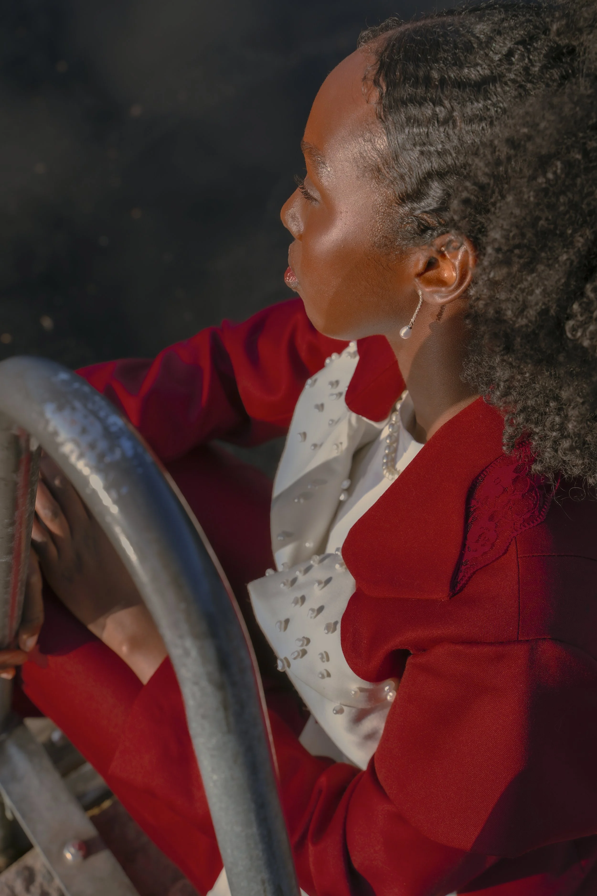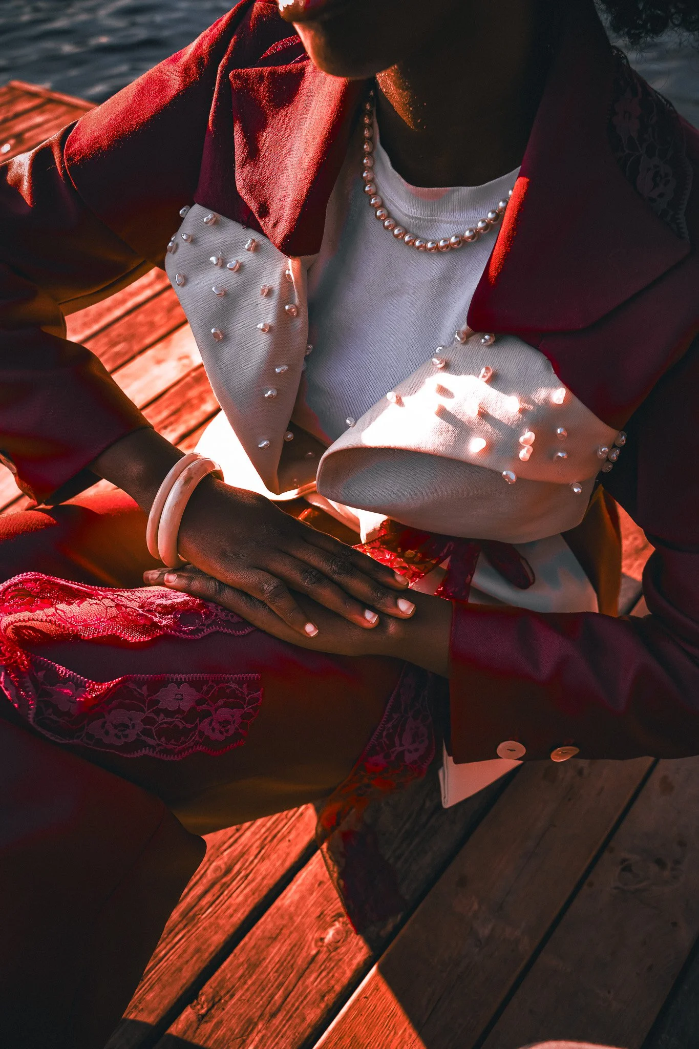 This outfit is part of a conceptual piece that explores the duality between inner strength and outer structure. The deep burgundy suit, paired with a deconstructed, asymmetrical top, represents a journey through contrasts — between the feminine and the masculine, vulnerability and power.